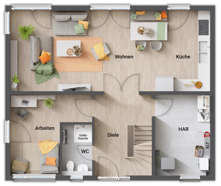 • gerade Treppe (zentral im Erdgeschoss, „teilt“ Koch- und Wohnbereich)