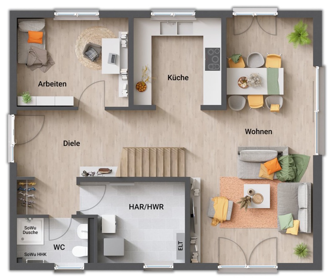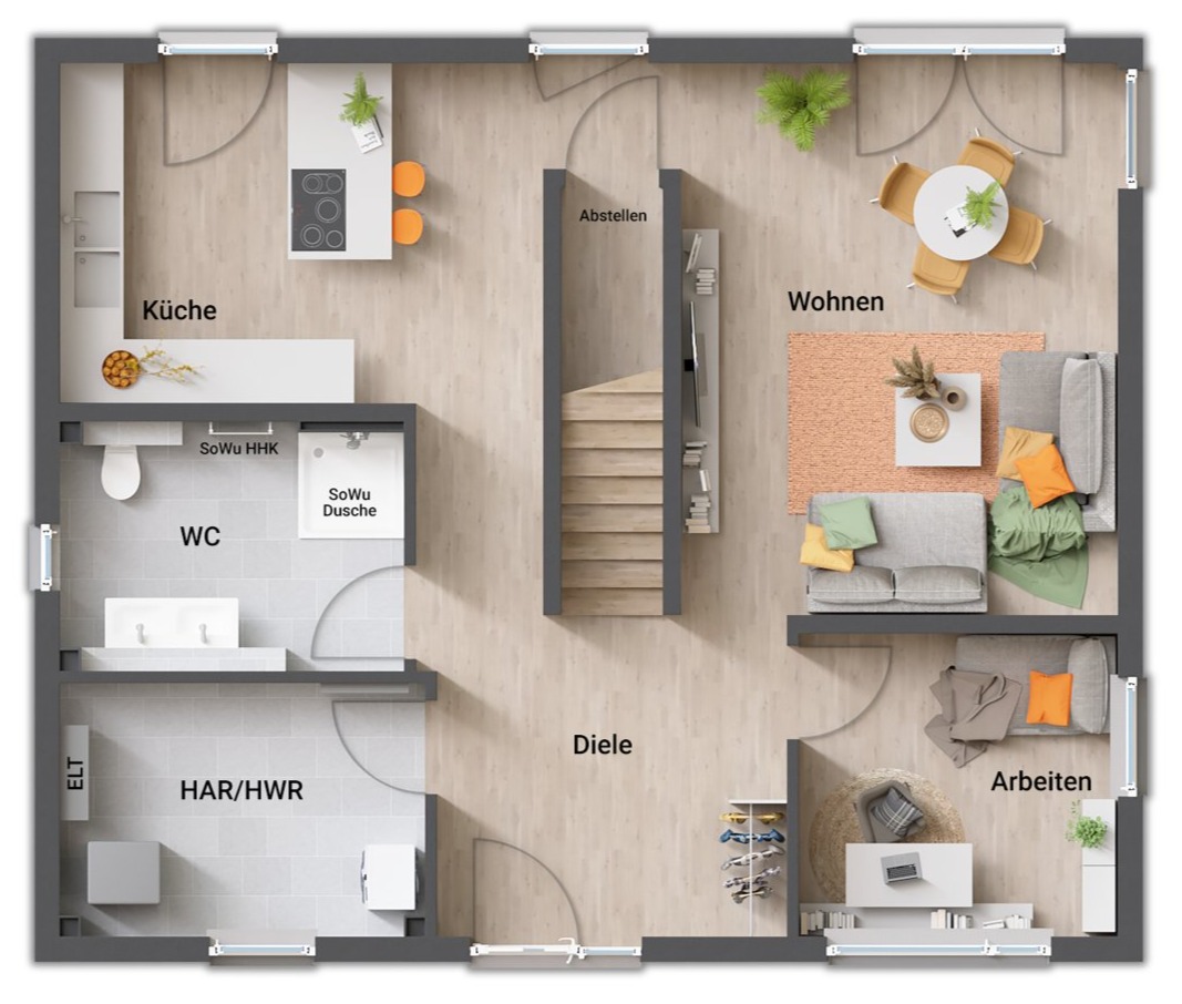 - gerade Treppe (zentral im Erdgeschoss, „teilt“ Koch- und Wohnbereich)