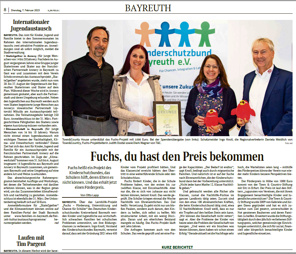 Am 06.02.2023 hat die Firma JenHaus GmbH in Vertretung von Daniela Weidlich und Geschäftsführer Herrn Dierk Wagner als Botschafter der Town & Country Haus Stiftung einen Scheck symbolisch an den Kinderschutzbund in Bayreuth übergeben um Projekte zur Lernförderung benachteiligter Kinder von Klasse 1- 12 übergeben.